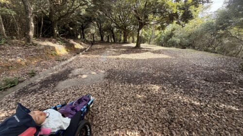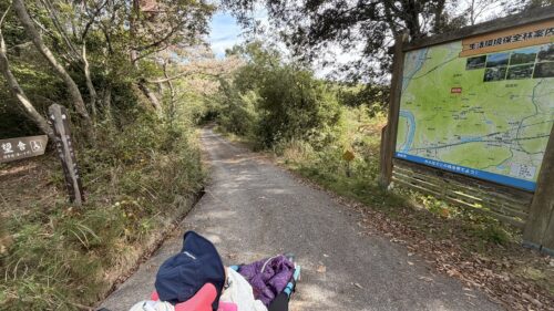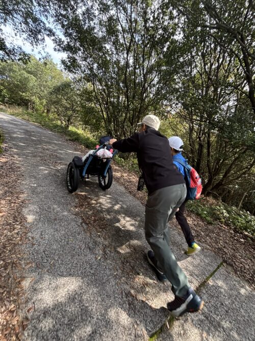 車を停めた所から遊歩道の入り口までは、ヒッポキャンプを押しながらゆっくり登っていきました。