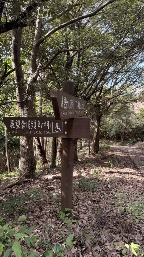 遊歩道の入口には「展望舎(遊歩道 車いす可)」と書かれた道標もあります。